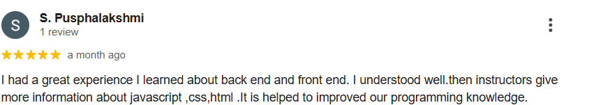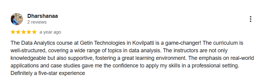 “Kudos to the team behind the Flutter course at Getin Technologies, Virudhunagar! The course structure is well-designed, catering to both beginners and intermediate learners. The instructors’ dedication to students’ success is truly inspiring. I’m thrilled with my progress in Flutter development!”